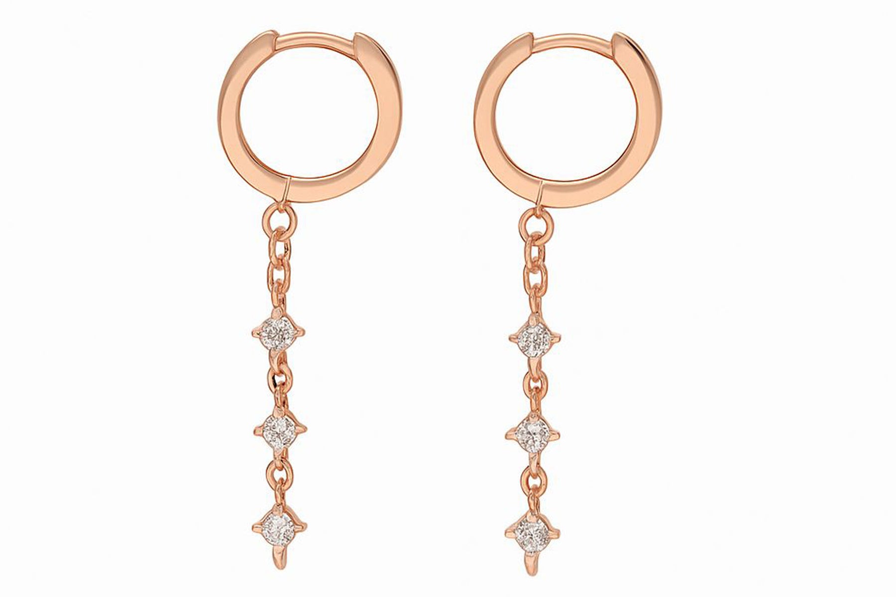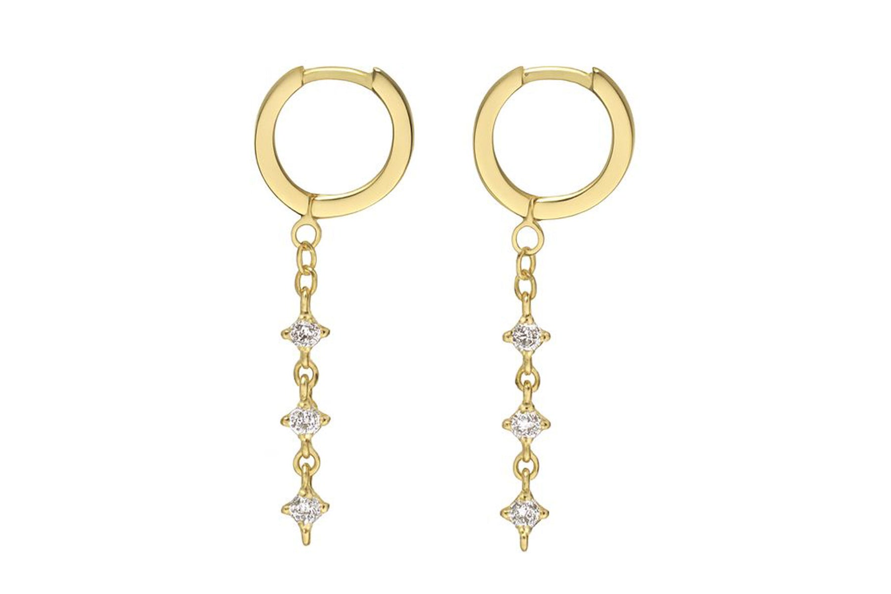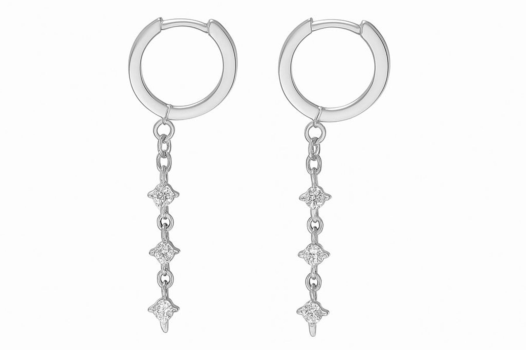 עגילי חישוק עם שרשרת תלויה משובצת 3 יהלומים בכל עגיל שיתאימו לכל אחת! העגילים מגיעים בזהב לבן צהוב או רוז גולד ומתאימים למראה היומיומי או לאירוע.